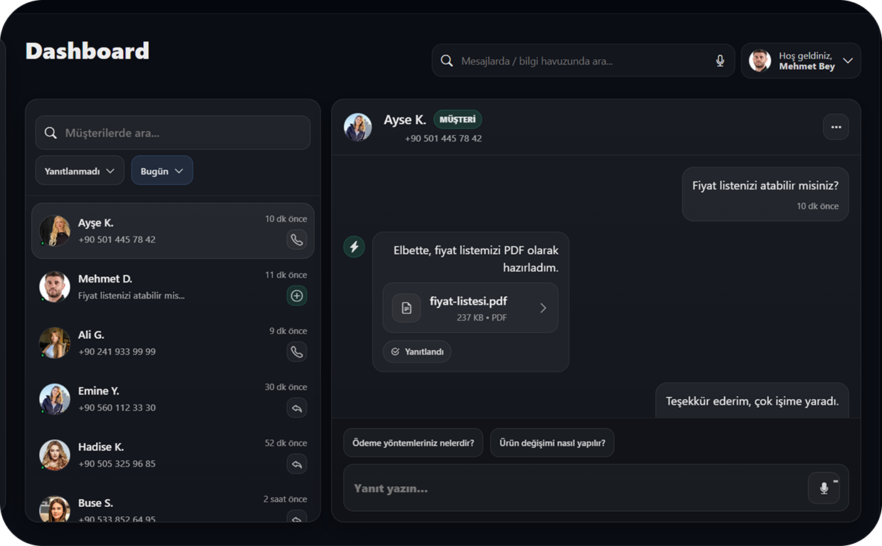 WhatsApp üzerinden gelen tüm müşteri konuşmalarını tek bir panel üzerinden görüntüleyebilir, sohbetleri takip edebilir ve gerektiğinde manuel olarak müdahale edebilirsiniz. Böylece müşteri iletişimini kolayca kontrol altında tutabilirsiniz.